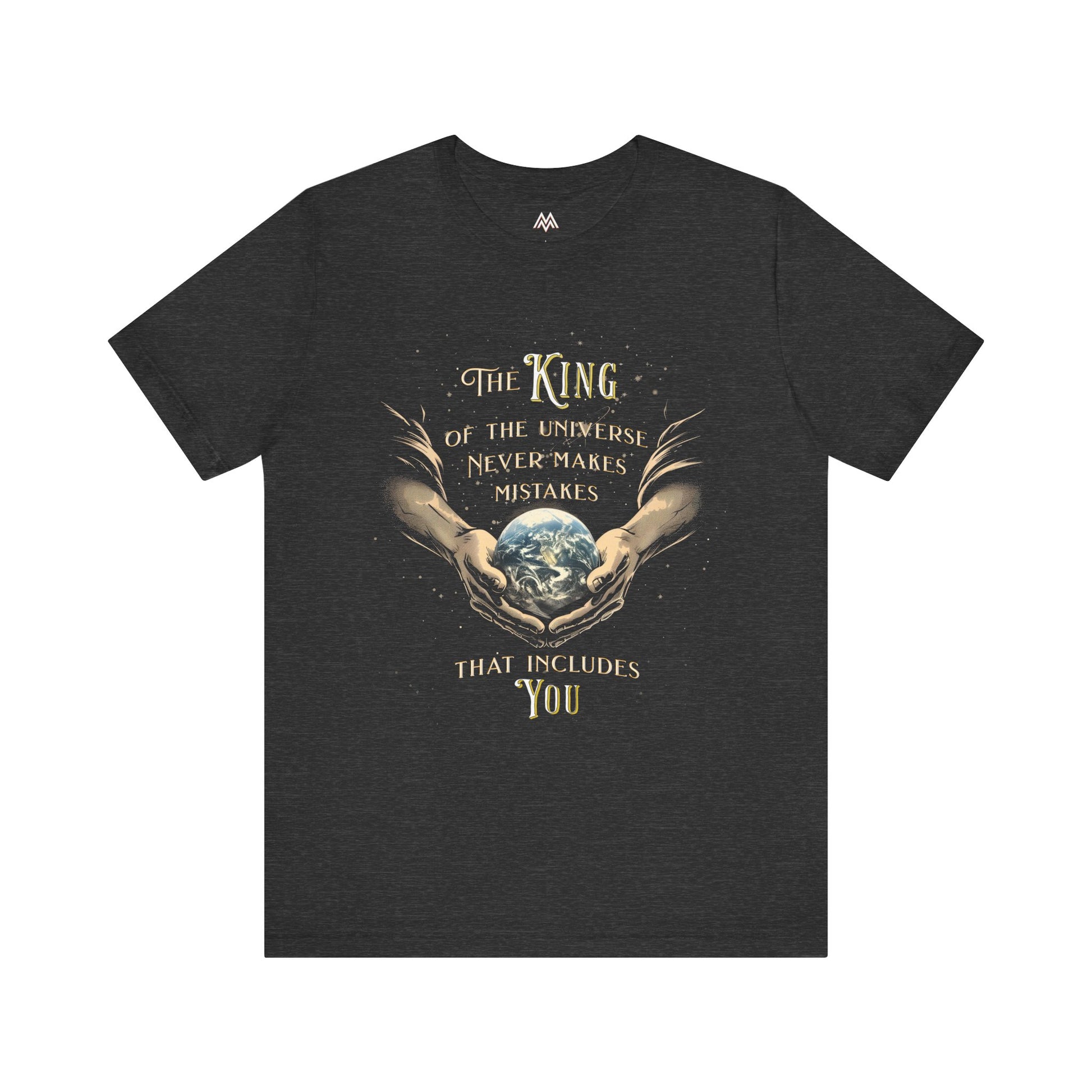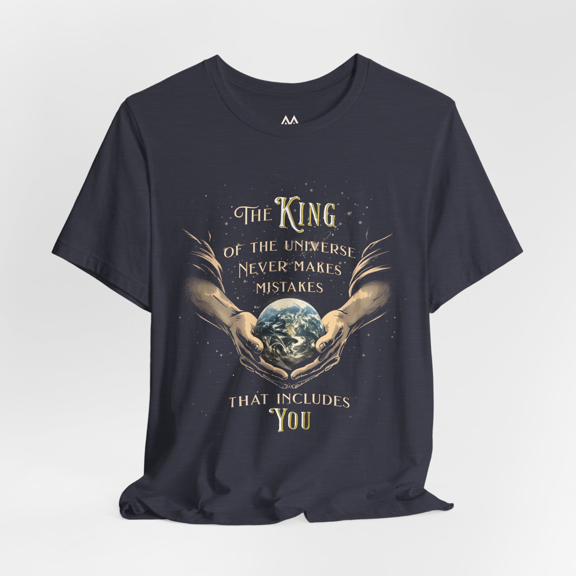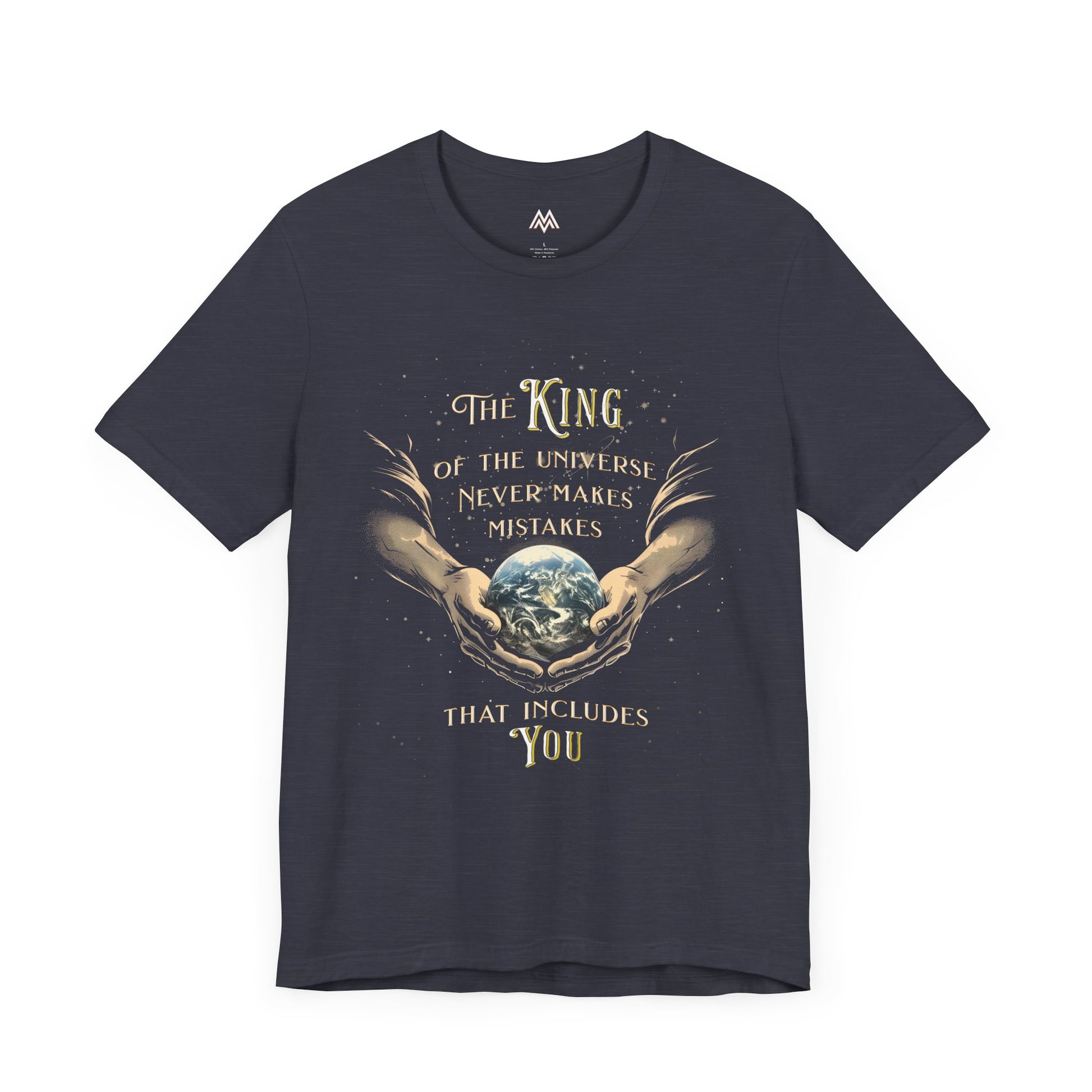 Carry a message of divine affirmation with this classic-fit t-shirt, featuring an image of Godly hands holding the world and the words 'The King of the Universe Never Makes Mistakes, That Includes You.' Made from a premium blend of cotton and polyester, this tee offers superior softness, durability, and a refined look. The lightweight fabric (4.2 oz) provides comfort for everyday wear, while the retail fit and ribbed knit collar ensure a perfect shape that holds up over time. Wear this shirt as a reminder that you are loved and cherished by a Creator who makes no mistakes.