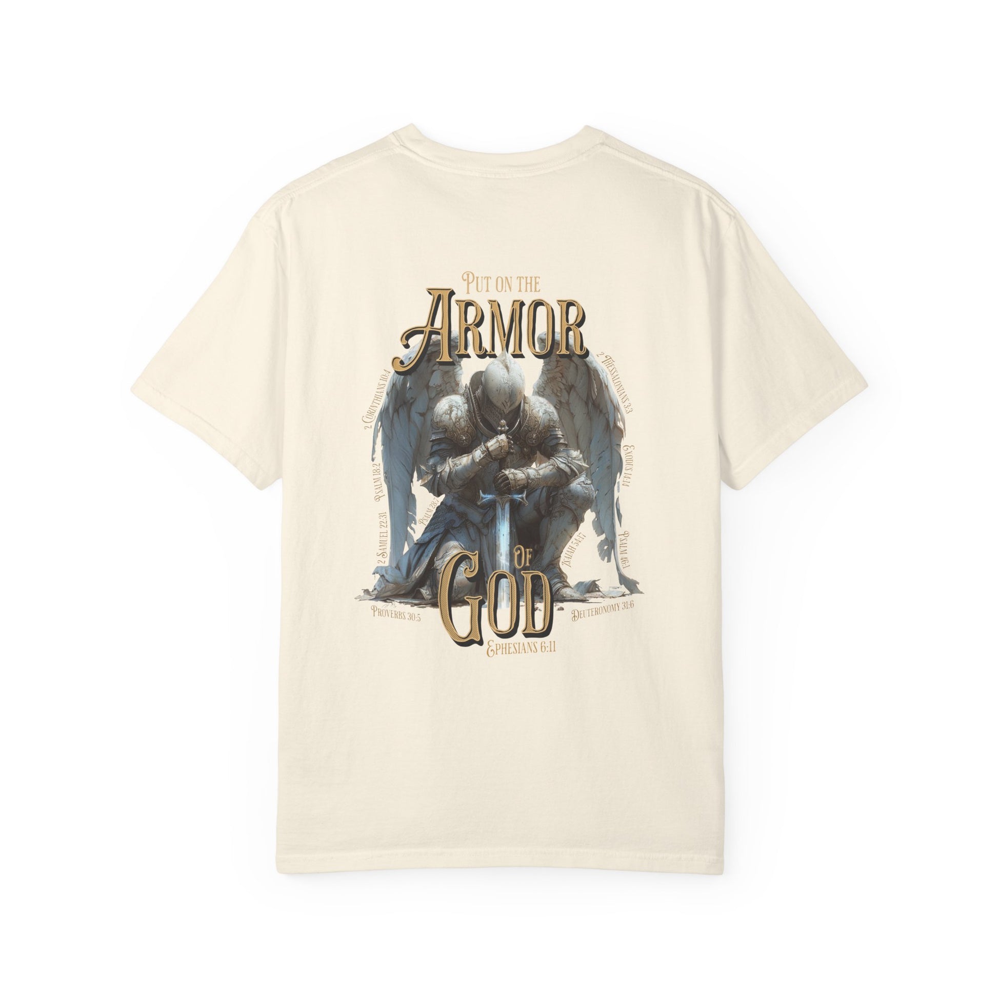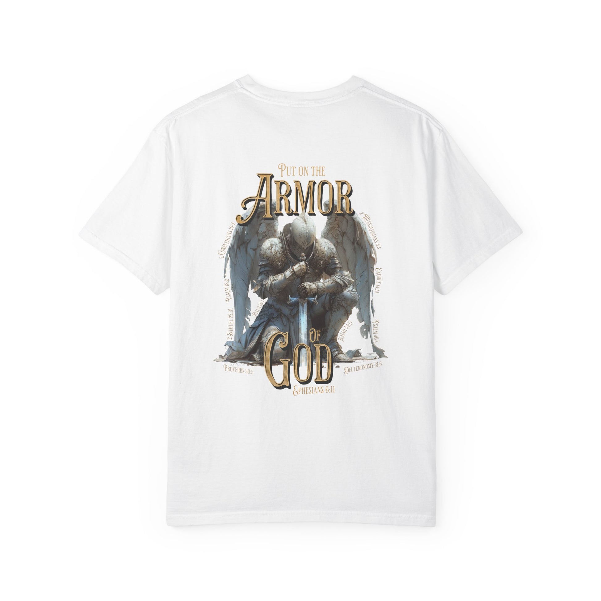 Stand strong in faith with our classic-fit t-shirt, featuring a powerful design of an angel in full armor and the inspiring words 'Put on the Armor of God.' Crafted from a superior blend of cotton and polyester, this tee offers enhanced softness and durability compared to regular cotton. The heathered texture adds a stylish touch with a oversized workout fee.