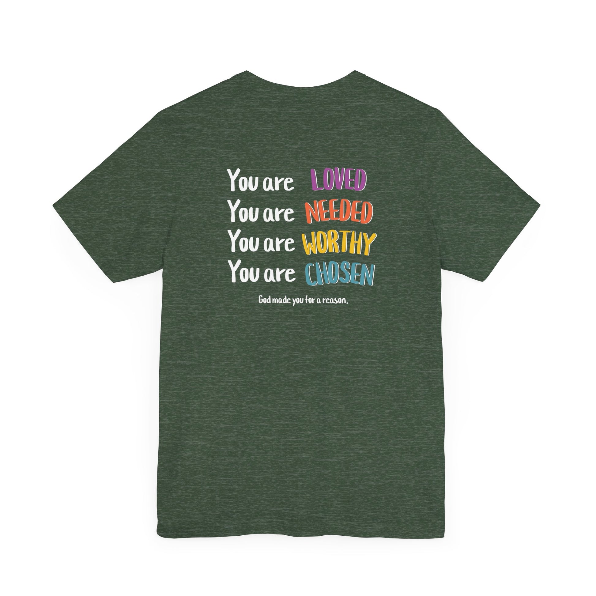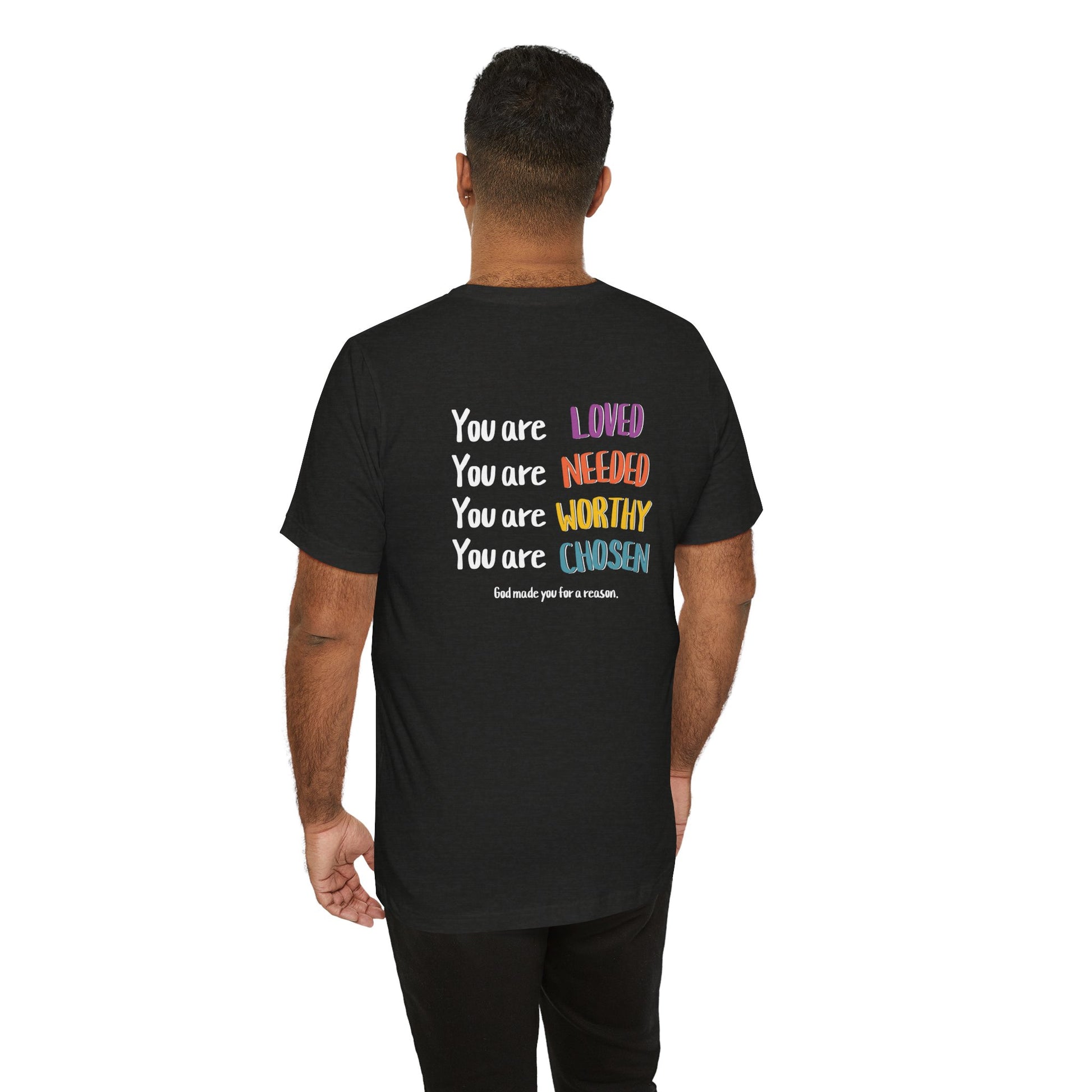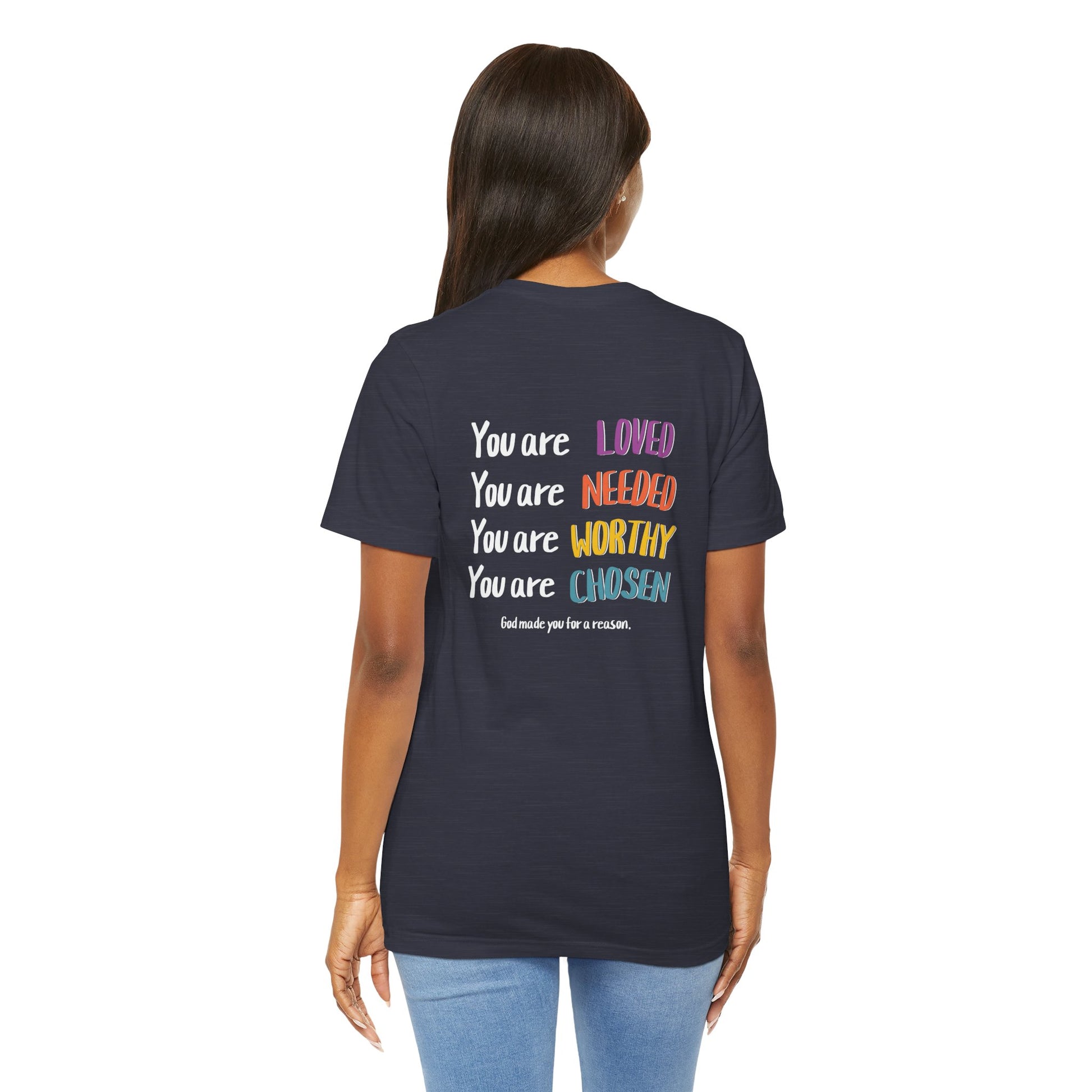 Embrace and share the profound message of affirmation with our 'You Are Loved, You Are Needed, You Are Worthy, You Are Chosen' t-shirt. This shirt is adorned with these empowering words on the back, crafted to inspire everyone who sees them. Designed not just for personal wear but to uplift and encourage others, this comfortable t-shirt serves as a powerful tool to spread a message of value and belonging. Whether worn to boost your own confidence or to positively impact those around you, it's an expression of solidarity and encouragement for anyone seeking reassurance.