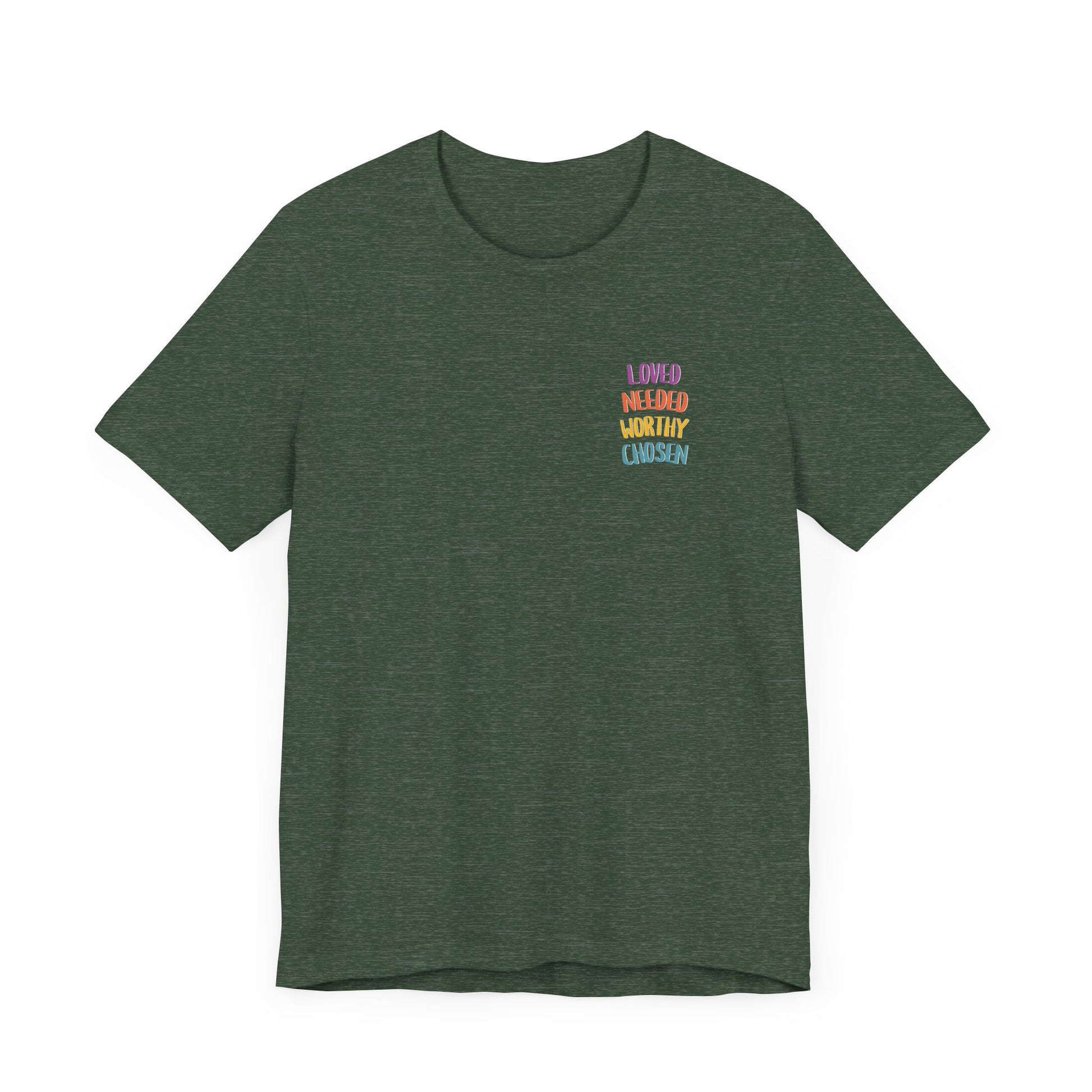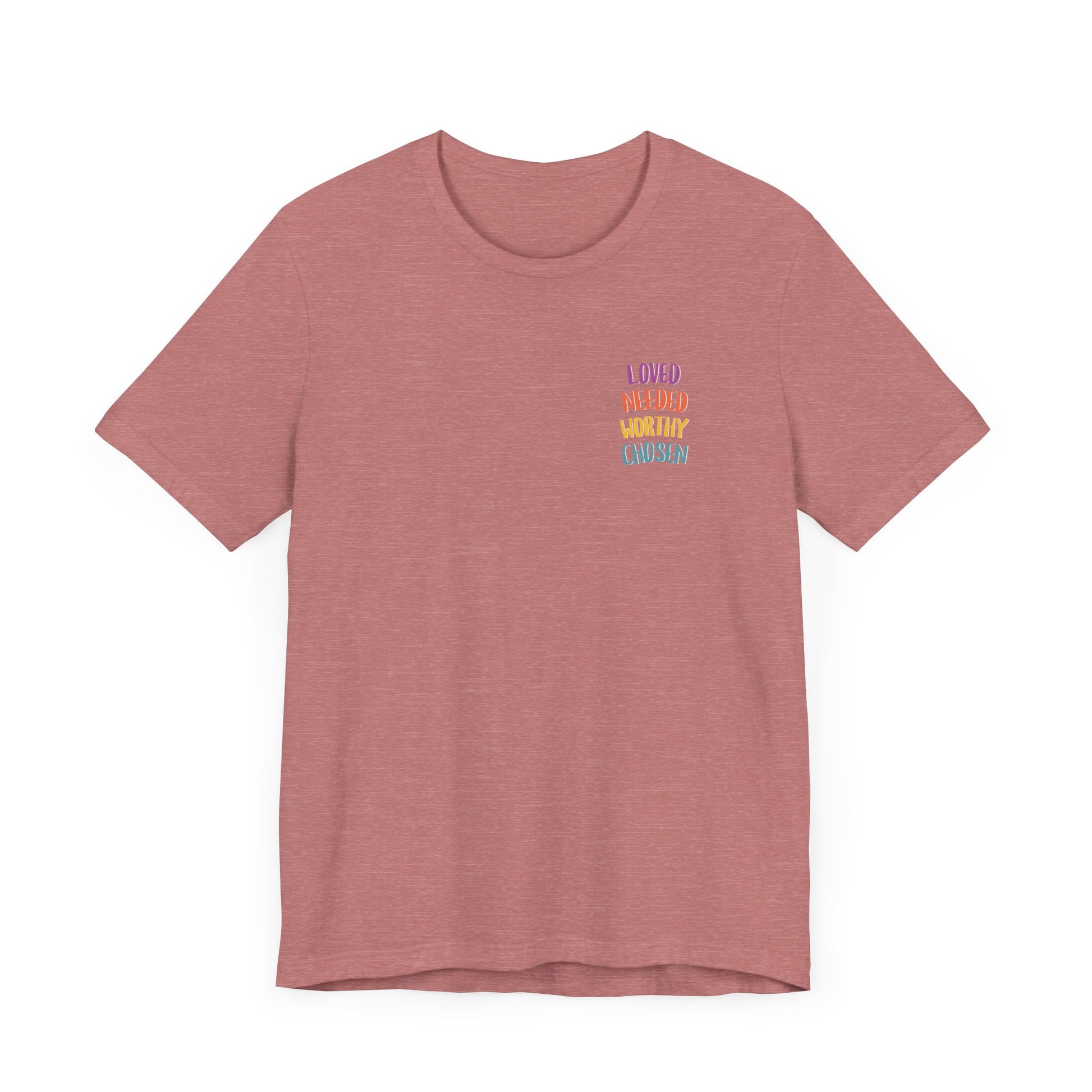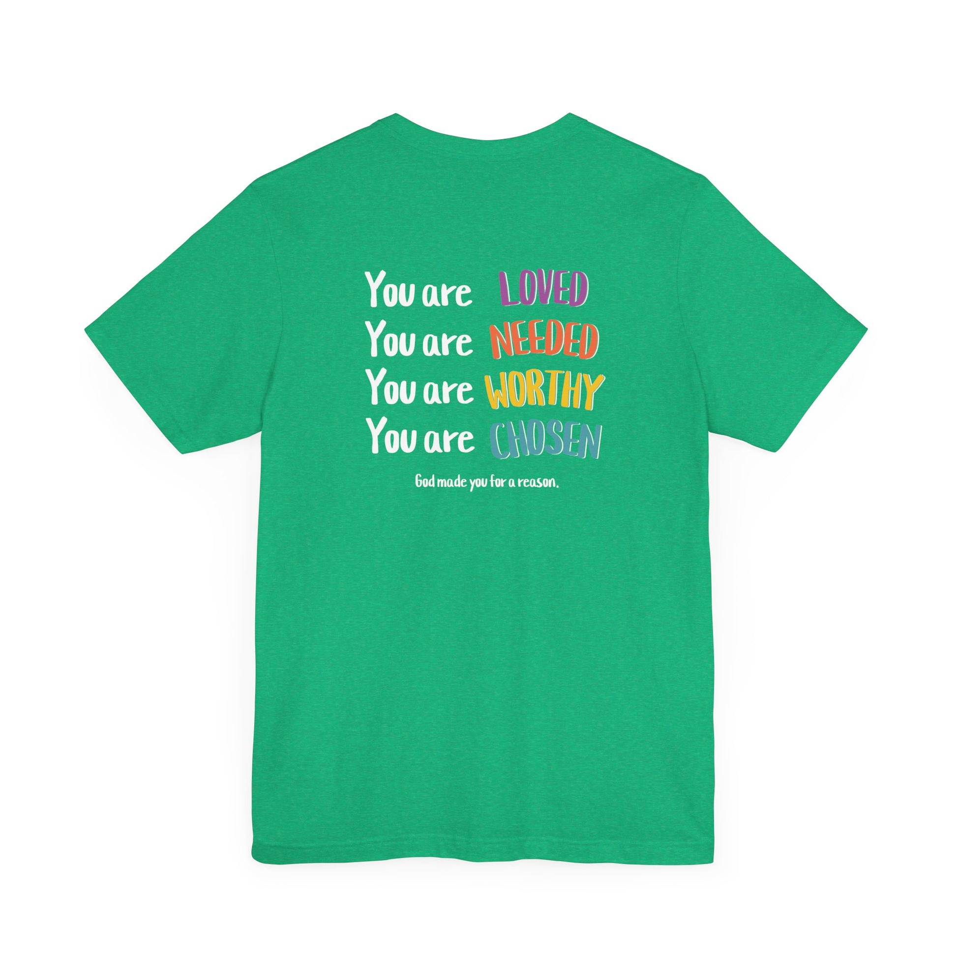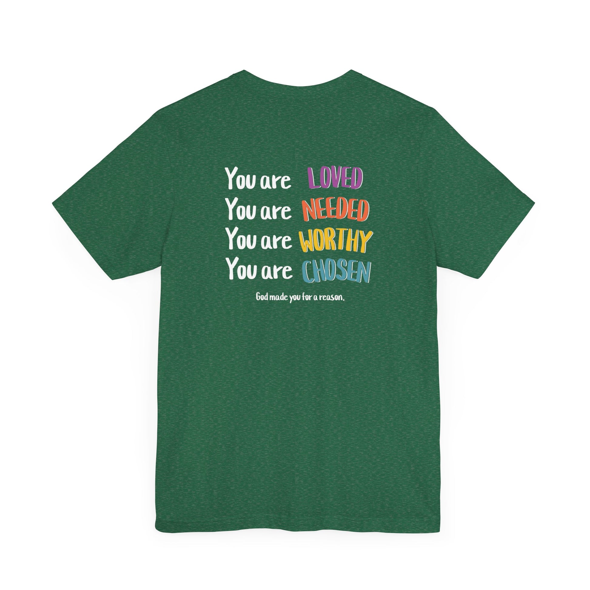 Embrace and share the profound message of affirmation with our 'You Are Loved, You Are Needed, You Are Worthy, You Are Chosen' t-shirt. This shirt is adorned with these empowering words on the back, crafted to inspire everyone who sees them. Designed not just for personal wear but to uplift and encourage others, this comfortable t-shirt serves as a powerful tool to spread a message of value and belonging. Whether worn to boost your own confidence or to positively impact those around you, it's an expression of solidarity and encouragement for anyone seeking reassurance.